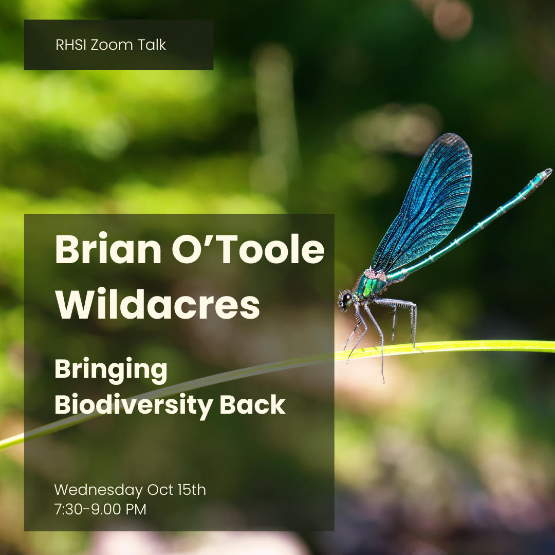 Join us for an inspiring evening with Brian O’Toole, co-founder of Wildacres Nature Reserve & Biodiversity Education Centre in County Wicklow. From its beginnings as overgrazed farmland, Wildacres has been transformed into one of Ireland’s most remarkable biodiversity success stories and the good news is, the lessons are replicable in gardens and green spaces across the country.