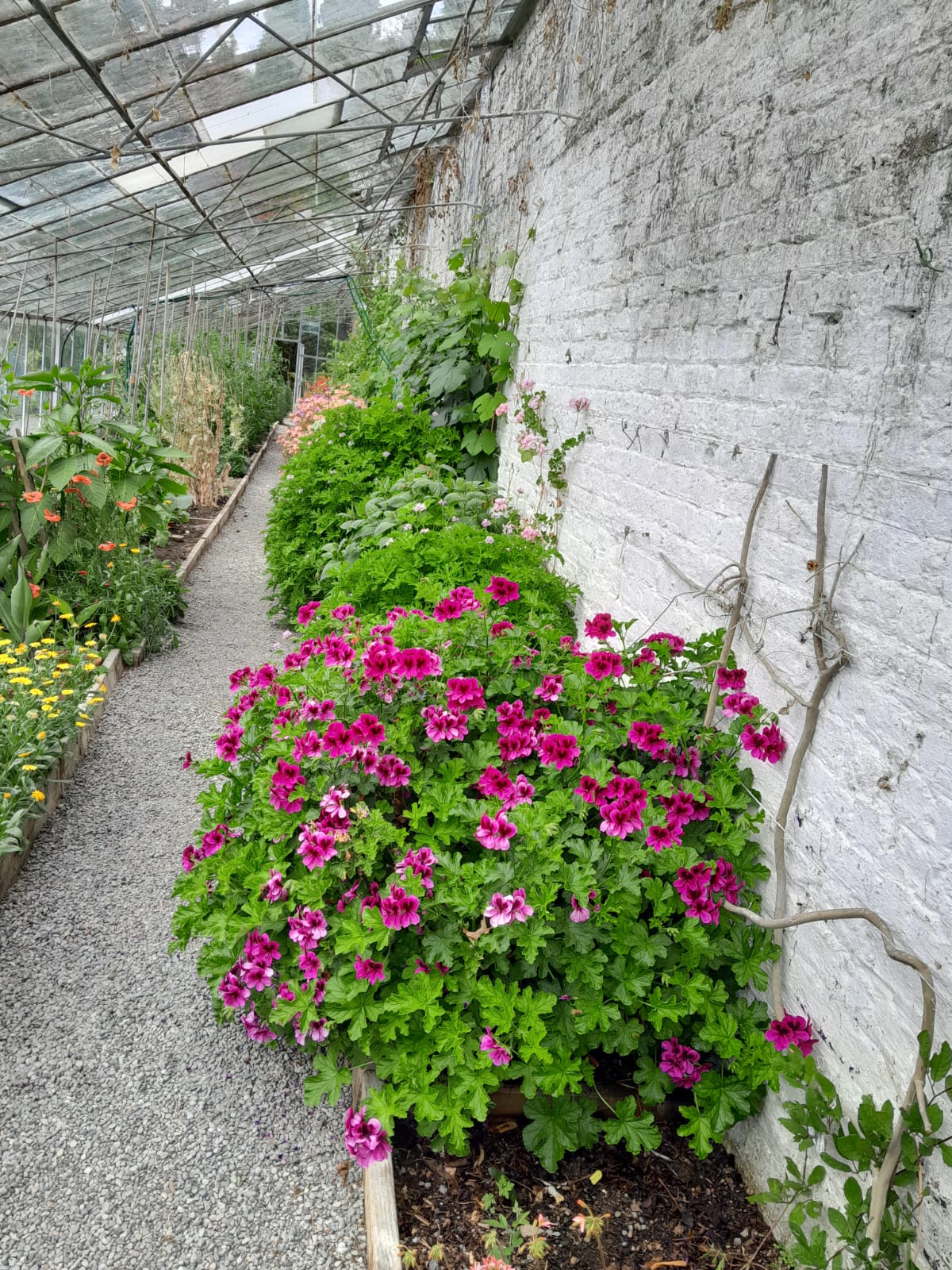 Inside, the bed along the wall contains the Pelargonium collection. They provide a wonderful colourful display for most of the year and dead heading by the volunteers encourages plenty of blooms. Three grape vines grown on the wall are, according to our records, Alicante, Vanessa and Himrod and summer pruning is underway. There are also climbing plants Asarina, Chilean Glory Flower, Plumbago white, Passion Flower and the beautiful Rhodochiton.