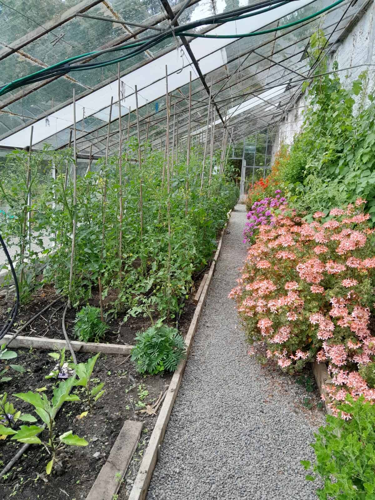 The glasshouse is also used to overwinter some of more tender plants like Cannas and Salvias and in spring to start dahlias into growth. Bedding plants are also grown on before planting out. A good spot on a wet day.