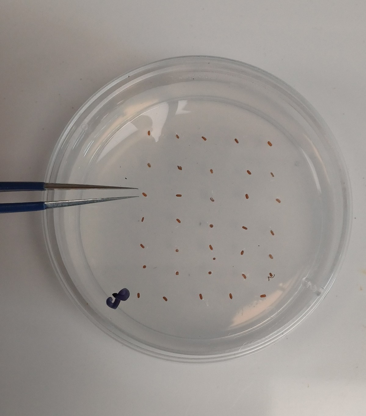 After seed are collected they are returned to the lab. Here they are kept cool and dried to an equilibrated relative humidity of 15%. This is a critical moisture level as it ensures the seed are dry enough to maximise storage potential, but not so dry that the seed is killed. As a general rule, for every 1% relative humidity the moisture content of the seed is reduced, it doubles the lifespan of the seed in storage. Once dry, the seed are cleaned and counted. A portion are then dissected under a microscope to check for fully developed embryos, and the presence of pests or pathogens. A further subset are then rehydrated and germinated to calculate what proportion of the seed are viable. Ideally there would be a target of 10,000 viable seed per banked species, but this figure can be difficult to achieve for rare or threatened species. The conditions under which seed are germinated can be adjusted to suit the ecological preferences of the species, and sometimes dormancy must be broken in order to accurately calculate viability rates. Any germinated seedlings of species of conservation concern are sent to the native plant nursery to be cultivated as part of the living collection. After establishing viability the remaining dry seed are sealed in foil packets, assigned a unique barcode identifier and frozen at -20°C where they can theoretically survive in perpetuity.