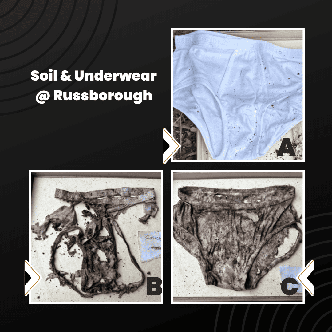Technically, this is called the Underwear Decomposition Test, colloquially the “The Pants Test”, and is designed to assess the levels of microbial activity and the small-beastie population in your soil. So, a 100% cotton brief is interred and its degree of degradation over 8 weeks is used as an indicator of your soil’s health (see A). In short(s), if the brief is a lot briefer over time then biological activity is higher and your soil is healthy (see B and C).