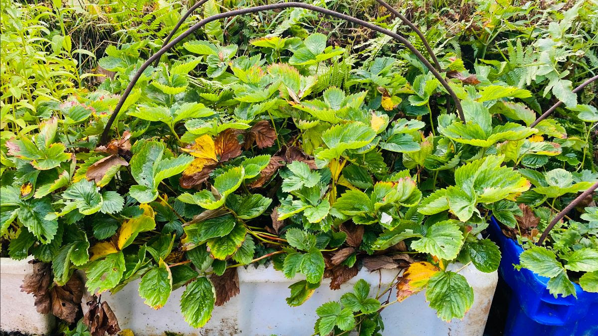 From as early as late April to mid October we harvest fresh fruit for our muesli every day: alpine strawberries, raspberries, and garden strawberries. The alpine strawberries are grown in seven pots in the polytunnel and some in our herb garden, raspberries are grown in an area of about 10 sqm and the garden strawberries in four fish boxes on the patio and ten plants in the polytunnel, different varieties ensure a long fruiting season. If we were to buy the amount we grow at a price of €5 for 2 we would spend about €375.